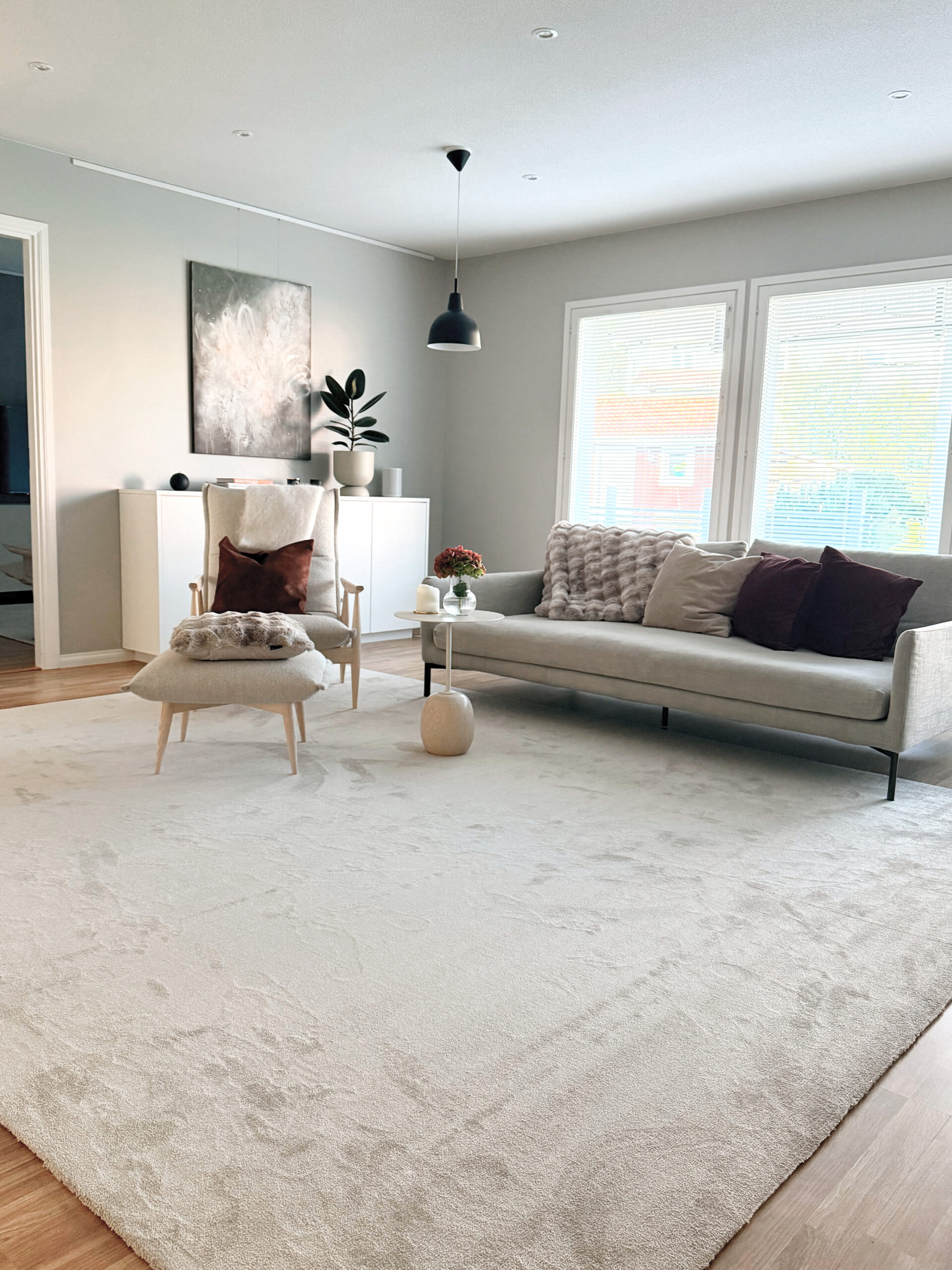Tähän kauniiseen ja harmoniseen olohuoneeseen valittiin tyylikäs VM Carpet Sametti -matto, joka viimeistelee tilan pehmeän ja rauhallisen tunnelman. Maton hienostunut pinta ja vaalea sävy korostavat luonnonvaloa ja luovat yhtenäisen, modernin ilmeen.